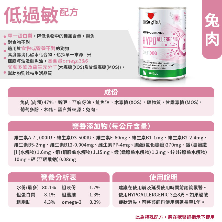 Disugual 意極鮮 處方糧 狗罐頭 低敏配方 兔肉 400g (DSDT002) | 意大利製造
