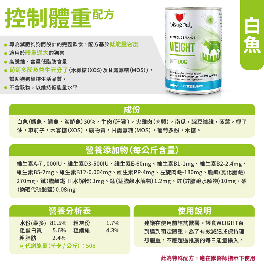 Disugual 意極鮮 處方糧 狗罐頭 控制體重配方 白魚 400g (DSDT072) | 意大利製造