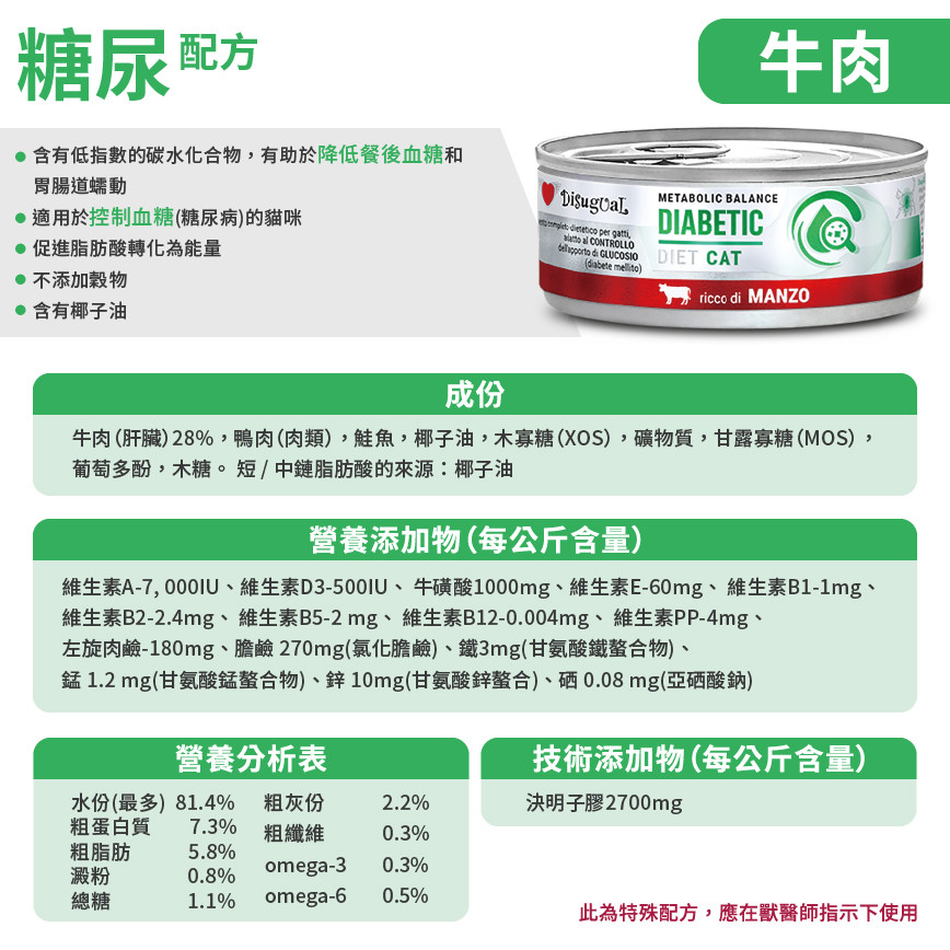 優質營養!Disugual 糖尿病配方貓罐頭 牛肉 85g,專為患糖尿病的成貓設計,意大利製造,提供均衡營養。助貓咪穩定血糖,健康生活。正貨保證,立即選購! Disugual 意極鮮 處方糧 貓罐頭 糖尿病配方 牛肉 85g (DSDTG080) | 意大利製造 - 限時優惠價