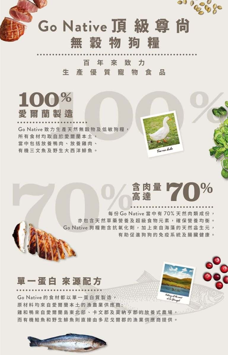 Go Native 狗糧是愛爾蘭頂級狗糧品牌,主打無穀物單一蛋白低敏配方,適合各種年齡段的狗狗。其狗糧含肉量高達70%,並堅持使用愛爾蘭本土食材,確保食品安全可追溯。此外,Go Native 狗糧在愛爾蘭設有自家研發中心,全程高規格監管生產細節,致力提供最頂級的狗糧。