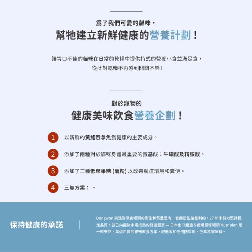 Nutriplan 營養企劃 的品牌故事源於對寵物健康的深刻理解與熱情。儘管具體的創立時間和早期發展細節未被詳細記載,但其核心理念「為寵物提供美味與健康的食品」一直貫穿品牌發展的始終。品牌在發展過程中,不斷投入研發,致力於將人類食品的標準應用到寵物食品中,確保產品的天然性、安全性和高營養價值。透過不斷的市場調研和消費者反饋,Nutriplan 營養企劃 逐步建立起其在寵物食品領域的專業形象,尤其在貓糧和貓罐頭方面,贏得了廣大寵物飼主的信賴和好評。