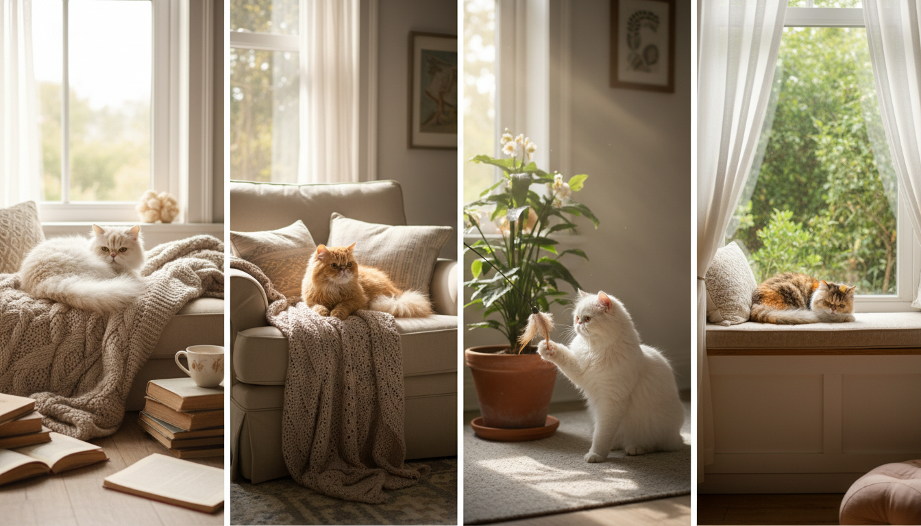 **玩具**也是環境中不可或缺的一部分。雖然波斯貓不追求高強度的玩耍,但一些互動性玩具(如逗貓棒、雷射筆)或益智玩具(如藏食玩具)可以刺激牠們的狩獵本能和智力,防止牠們感到無聊。貓抓板或貓抓柱更是必不可少,不僅能滿足貓咪磨爪的需求,保護家具免受破壞,也能幫助牠們伸展身體。最後,為貓咪提供一個可以**獨處的安靜角落**,無論是高處的貓窩,還是隱蔽的紙箱,都能讓牠們在感到壓力或需要休息時,有一個屬於自己的避風港。總之,為波斯貓創造一個細緻周到、清潔舒適且安全的家居環境,是牠們健康生活的基石。