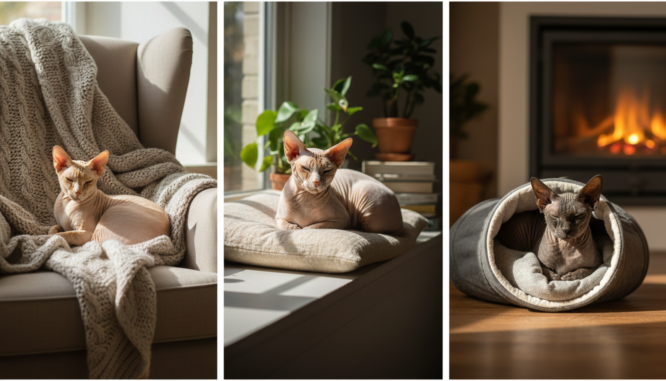最重要的環境要求是「溫暖」。由於沒有厚重的毛髮來保暖,斯芬克斯貓的身體需要消耗更多能量來維持體溫,因此牠們對寒冷非常敏感。理想的室內溫度應保持在攝氏20至25度之間。在香港的冬季,雖然氣溫不會像北方國家那麼極端,但濕冷的天氣依然會讓無毛貓感到不適。飼主需要確保家中配備暖氣設備(如暖風機、電暖爐,但要注意安全,避免貓咪直接接觸發熱元件導致燙傷),或者為貓咪提供多個溫暖舒適的睡墊、毛毯或貓窩。牠們尤其喜歡鑽入被窩或靠近熱源的地方取暖。避免讓貓咪長時間待在冷氣直吹的區域,即使在夏季,冷氣溫度也不宜過低,並確保牠們有地方可以避開冷風。